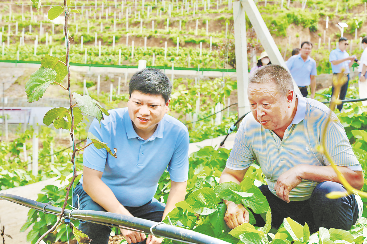 雨花臺區(qū)對口幫扶丹鳳縣聯(lián)絡(luò)組組長、丹鳳縣委常委、副縣長薛偉在狝猴桃種植園查看狝猴桃生長情況。