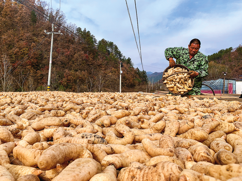 近期,丹鳳縣巒莊鎮(zhèn)天麻進入收獲期,群眾在晾曬天麻。