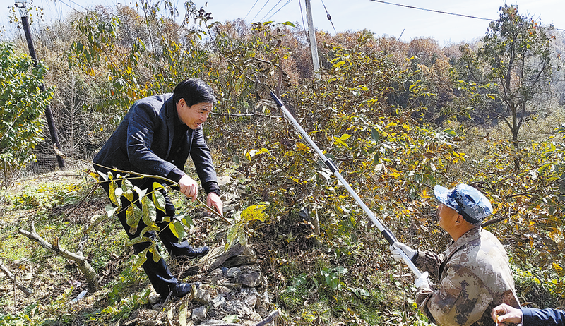 近日,李德俊(左)與山西核桃科管師傅在種植基地交流秋冬季核桃修剪技術(shù)。