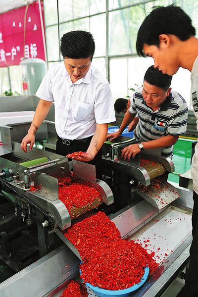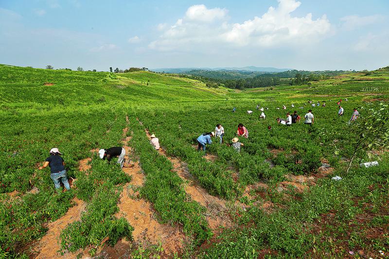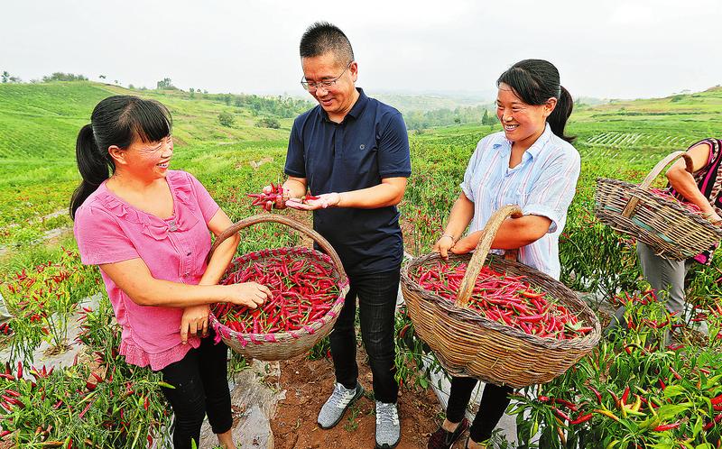 2017年春,洛南縣靈口鎮(zhèn)山村教師馬會(huì)鋒用愛人經(jīng)商多年的積蓄,創(chuàng)建洛南縣“辣上天”種植專業(yè)合作社,引導(dǎo)群眾種植辣椒,以期帶領(lǐng)群眾過上紅紅火火的好日子。馬會(huì)鋒的壯舉得到各方認(rèn)可,帶著“鄉(xiāng)親們共富”的美好愿望,大家積極協(xié)作,攜手共進(jìn)。南京市扶持合作社500萬元對口幫扶資金,解決其發(fā)展資金問題;洛南縣鼓勵(lì)貧困戶積極種植,給貧困戶每畝補(bǔ)助500元,擴(kuò)大產(chǎn)業(yè)規(guī)模;國家郵政集團(tuán)公司在全縣扶持37個(gè)村,種植辣椒8080畝,壯大村級集體經(jīng)濟(jì),為脫貧攻堅(jiān)助力。目前,合作社在洛南、商州、河南靈寶等地發(fā)展產(chǎn)業(yè)基地3.5萬畝,帶動(dòng)貧困戶6800多戶,占全縣2018年計(jì)劃脫貧戶9202戶的73.9%。9月15日,合作社產(chǎn)量抽樣調(diào)查顯示,辣上天種植專業(yè)合作社將實(shí)現(xiàn)產(chǎn)值1.3億元,戶均增收4000元以上。金秋時(shí)節(jié),記者在“辣上天”收獲季記錄了這項(xiàng)扶貧產(chǎn)業(yè)的發(fā)展傳奇。