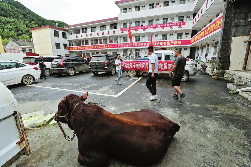 7月26日,洛南縣洛源鎮(zhèn)政府大院里,工作人員正在登記愛心人士捐獻(xiàn)的各類救災(zāi)物資,分發(fā)給受災(zāi)的村組,其中一頭黃牛引起記者的注意。