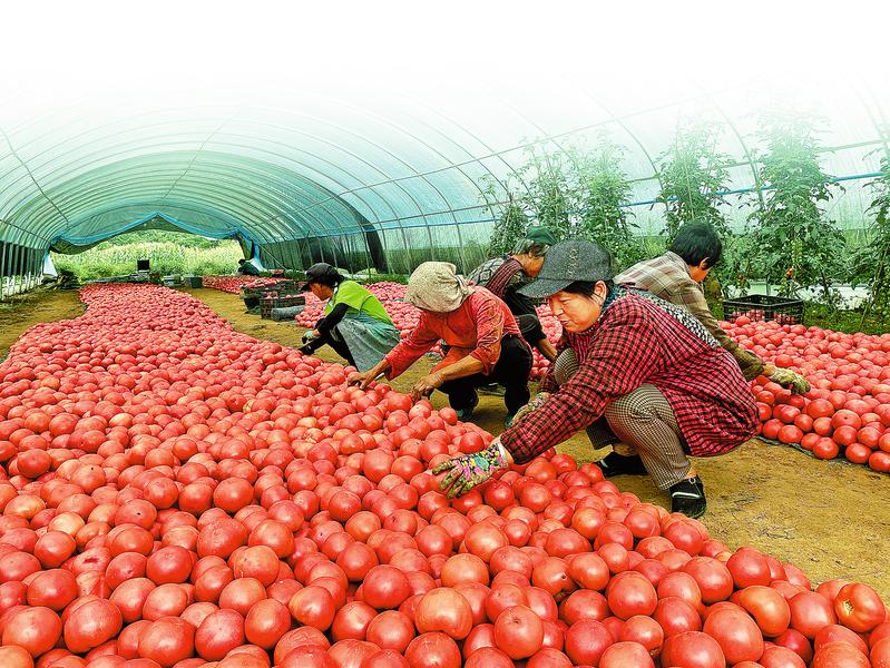 8月18日,筆者走進(jìn)洛南縣古城鎮(zhèn)中聯(lián)村集體經(jīng)濟(jì)蔬菜大棚,只見鮮紅欲滴的西紅柿掛滿了枝頭,在綠葉的映襯下顯得格外嬌艷奪目,大棚內(nèi)散發(fā)著誘人的果蔬香甜。進(jìn)棚務(wù)工的村民正在采摘西紅柿,等待裝箱的西紅柿像紅色的地毯一樣鋪滿地面,一派豐收喜人的景象。