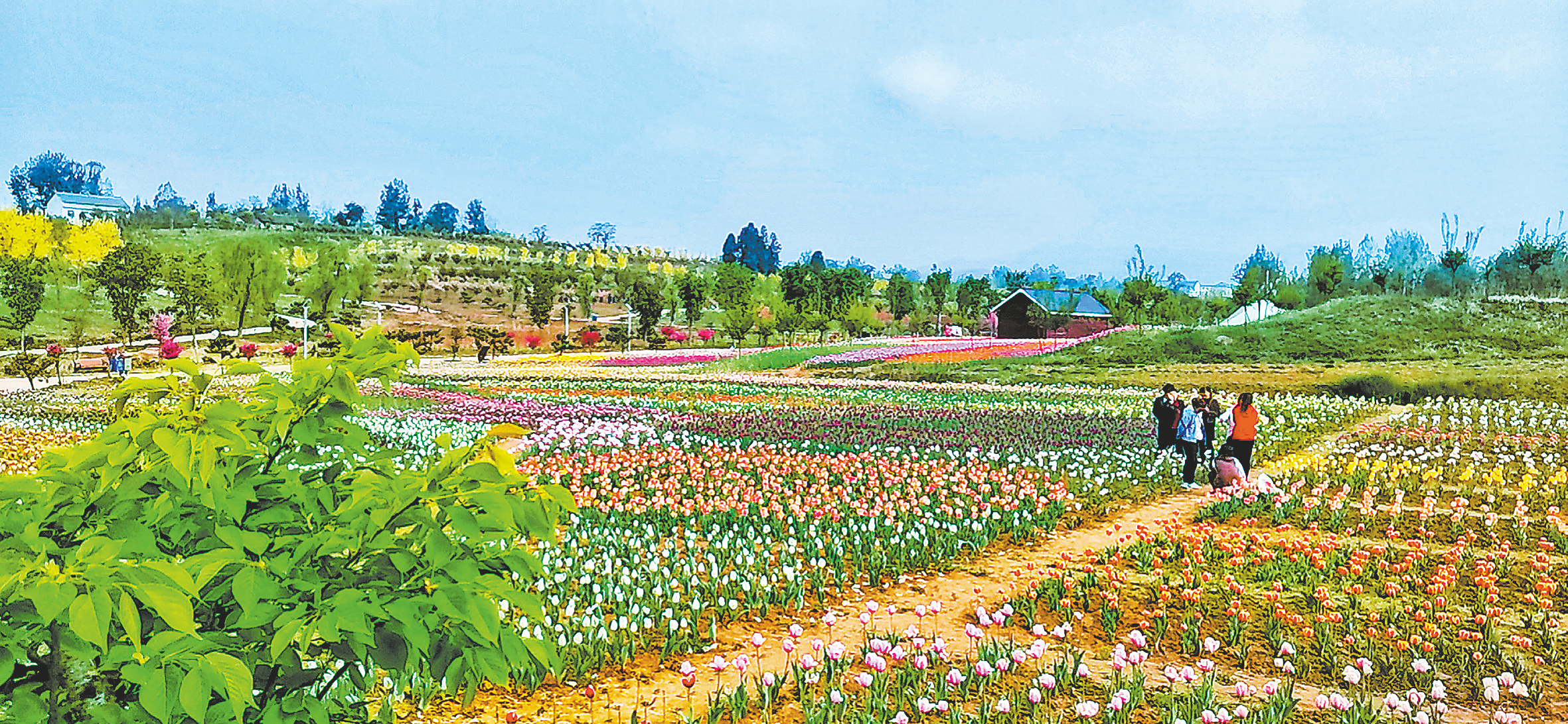 隨著氣溫回升,洛南縣錦繡大地園區(qū)20多個品種110萬株郁金香爭相綻放。色彩繽紛的郁金香和園區(qū)內(nèi)各種觀賞喬木將田園花谷、錦繡花溪裝扮得分外美麗。圖為錦繡大地園區(qū)一角。(記者 楊 鑫 攝)