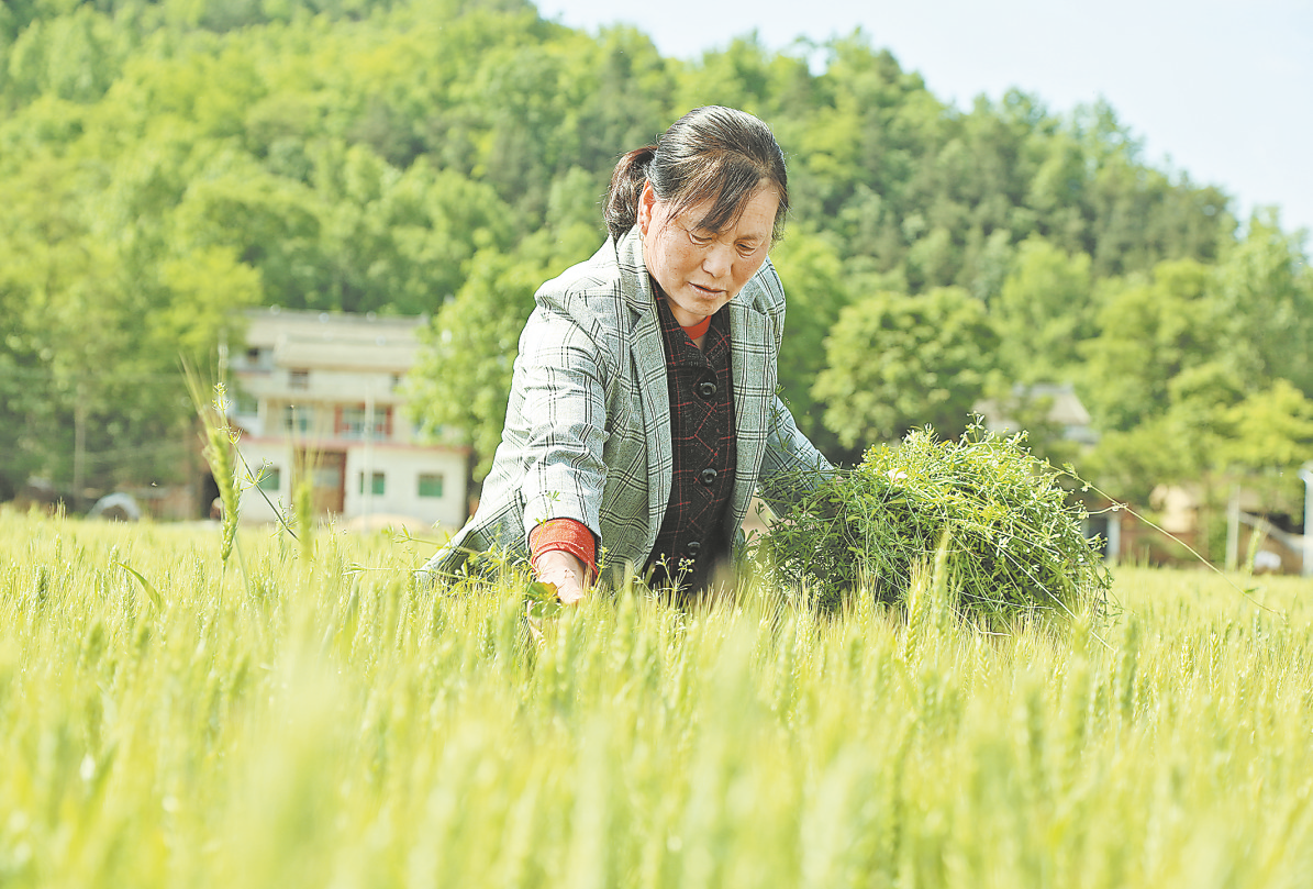 村民在麥田間去除雜草,辛勤勞作。