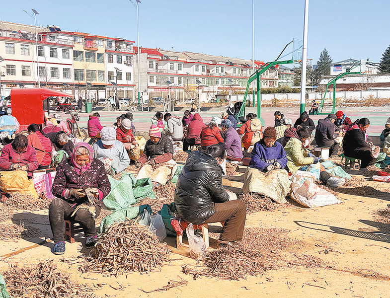 興龍嶺廣場(chǎng)上刮桔梗的繁忙景象,正是古城鎮(zhèn)延伸中藥材產(chǎn)業(yè)鏈、提升產(chǎn)業(yè)價(jià)值的生動(dòng)體現(xiàn)。近年來(lái),古城鎮(zhèn)立足桔梗、連翹、天麻等道地藥材的種植傳統(tǒng)與區(qū)位優(yōu)勢(shì),以特色產(chǎn)業(yè)振興為抓手,推動(dòng)中藥材產(chǎn)業(yè)穩(wěn)步發(fā)展。截至2025年年底,全鎮(zhèn)以丹參、連翹、桔梗等為主的中藥材種植面積已有1.6萬(wàn)畝,形成規(guī)?;?、多樣化的新發(fā)展格局。