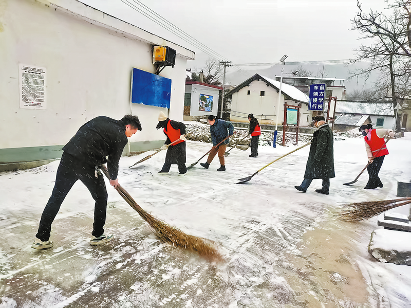 面對(duì)降溫降雪給群眾生產(chǎn)生活帶來(lái)的不便和困難,我市各地及時(shí)組織人員開(kāi)展鏟冰除雪保暢工作。圖為1月19日,洛南縣保安鎮(zhèn)組織集鎮(zhèn)單位、駐村工作隊(duì)和志愿者清理道路冰雪,確保群眾出行平安。 (本報(bào)通訊員 楊開(kāi)讓 攝)