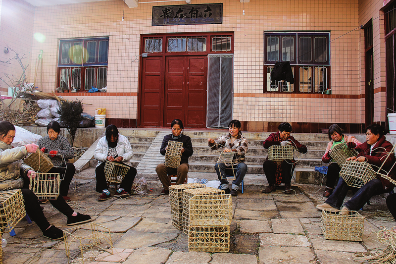 在四皓街道撫龍灣社區(qū),幾名村民圍坐一起編織草編產(chǎn)品。洛南巧手工藝品有限公司將生產(chǎn)基地建在群眾家門口,讓全縣1萬多名群眾實(shí)現(xiàn)家門口就業(yè)。