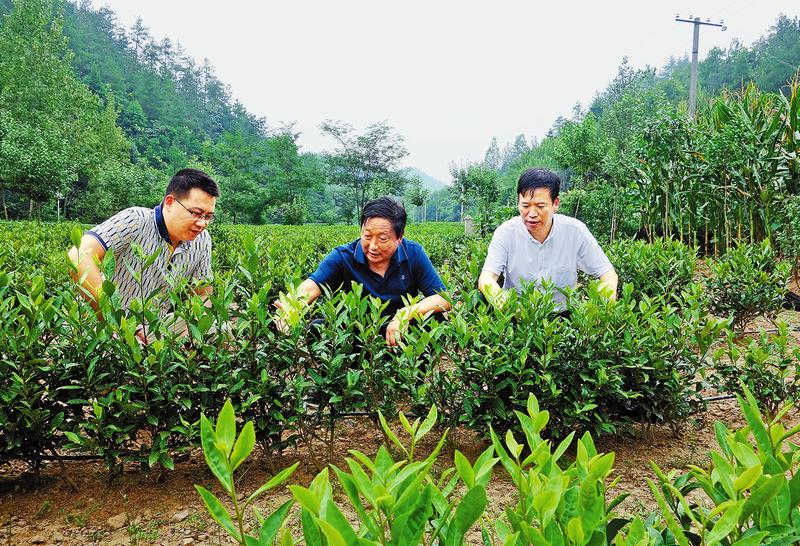 吳承奎(中)和鎮(zhèn)上干部查看茶樹生長(zhǎng)情況