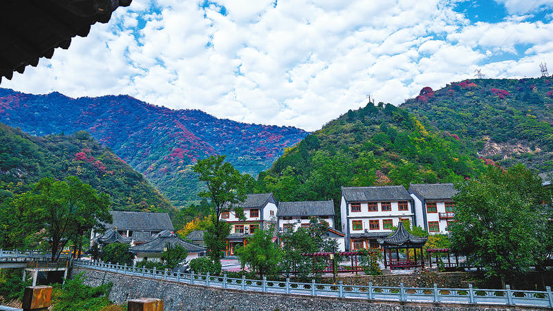 走進金絲峽,漫天的飛鳥于空中盤旋飛舞,古色古香的亭臺樓閣與紅綠交織的山巒相映成趣。流云浮現(xiàn),光影攢動,金絲峽像一位妝容精致的古典少女,吸引著來自各地的游客。