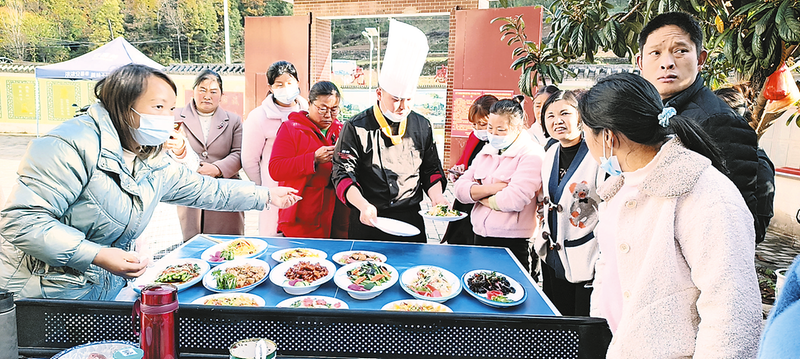 ?、俅迕裾谖寡颌诖迕裨谏n術(shù)種植基地內(nèi)除草③蛋雞養(yǎng)殖基地內(nèi)工人正在喂雞④毛起建正在查看蜜蜂生長情況⑤后坪村村民正在進(jìn)行廚師技能大賽