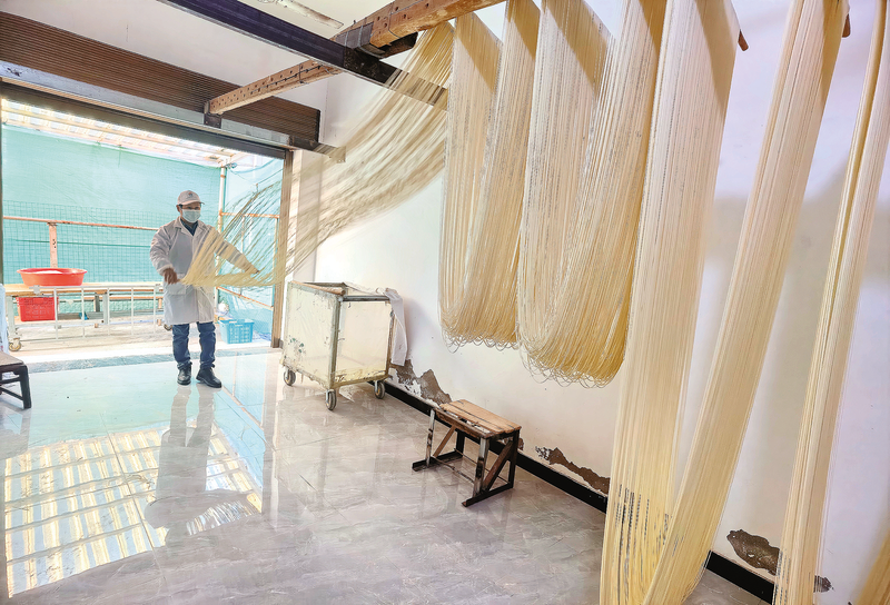 上午八九點(diǎn)鐘,當(dāng)日光變得溫潤,馮新瑞便將醒好、盤好面條的面筷插上數(shù)米高的面架。“溫度到16℃,濕度在60%左右時(shí),面條的發(fā)酵最是恰到好處,能拉出細(xì)如發(fā)絲而不斷的掛面。”說話間,只見他手執(zhí)長(zhǎng)長(zhǎng)的面筷,在垂落的面束間一撥、一拉,長(zhǎng)長(zhǎng)的銀絲傾瀉而出,在陽光下泛著光芒。這“面瀑”不僅是美味,更是一件“非遺藝術(shù)品”。