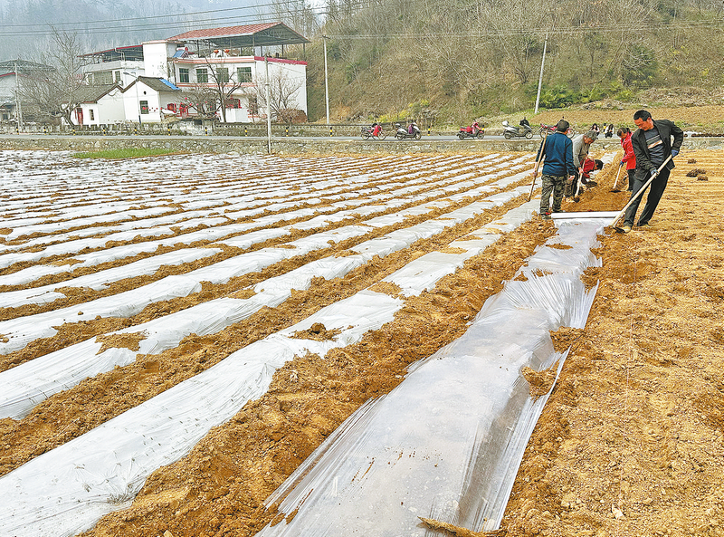村民搶抓晴好天氣,開展地膜覆蓋作業(yè)。