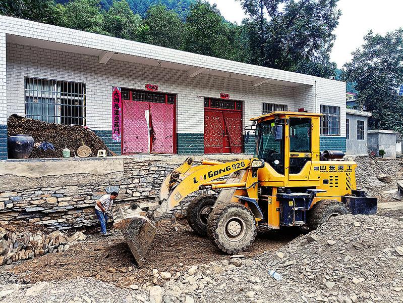 臨近雙寨村村委會的小西溝組也受到了洪水的侵襲。見到村民張平時,他滿身的泥土,正在清理門前的淤泥,用石頭填充地基。張平的房屋距離河道10多米,地基有2米多高,但洪水依然涌上了門前的臺階,墻上仍有泥水的痕跡。“半夜3點多聽到廣播響,我和家人馬上起床,到村委會打地鋪。”張平告訴記者,他家的地基被掏空,豬也被洪水從豬圈里沖了出來,村委會有方便面和水,那就是他們的避難所。此時,張平家對面已經(jīng)架起了新的電線桿,旁邊斷裂的水泥橋也在進一步修復中。