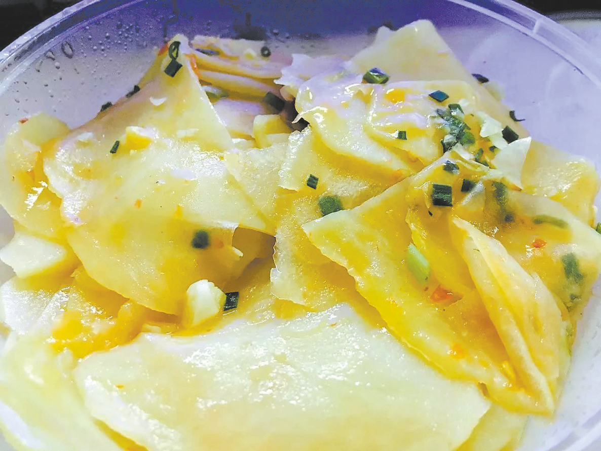 村人愛用馬鈴薯做菜,做的最多的是馬鈴薯片:先將馬鈴薯刮皮,洗凈,如碩大的白玉一樣。再用菜刀“嚓嚓嚓”快切成片,薄薄的,如紙一樣透亮。再洗一遍,下開水中一滾撈起,放在那兒晾著。然后,剝上幾頭肥胖的蒜,放在臼窩里,和精鹽一起搗成蒜泥,和香油、醋一起,兌水攪拌成蒜汁,澆在馬鈴薯片上。過一會兒,用筷子夾一片嘗嘗,脆生生的,酸溜溜的,還帶著一股大蒜的香味。