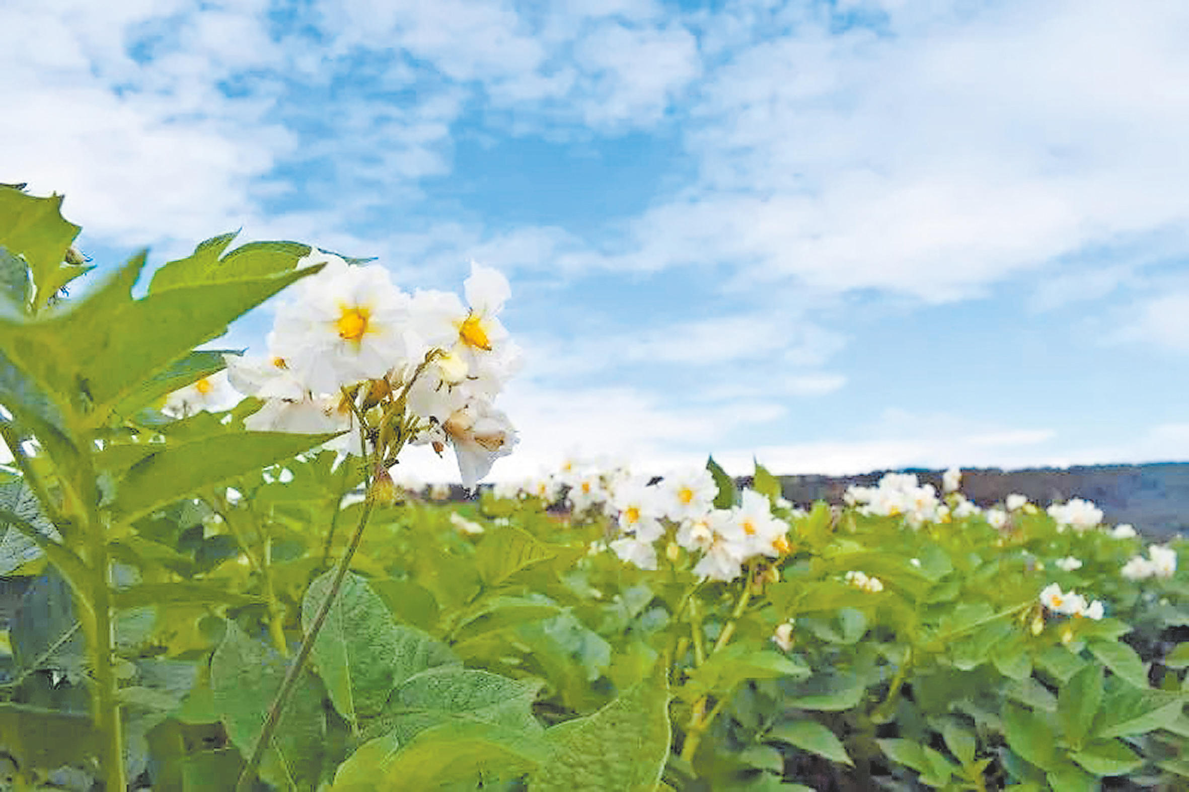 馬鈴薯苗上開了花兒,紫中透白,中間是嫩黃的花蕊,好像玉石雕琢的藝術(shù)品。