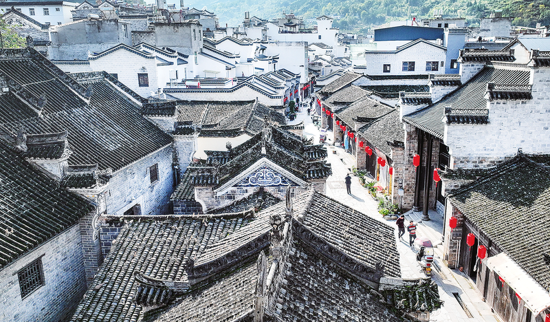 晨曦初露,薄霧如紗般籠罩著秦嶺南麓的層巒疊嶂,千年古鎮(zhèn)正從沉睡中蘇醒。明清街青石板路被歲月磨得溫潤,“和”字石刻在晨曦里閃耀著金光。隨著清脆的腳步聲漸次響起,街道兩旁的商戶開啟了一天的忙碌:卸下斑駁的門板支起攤點,擺上苞谷酒、臘肉、蜂蜜等土特產(chǎn)……仿佛在一瞬間,古街便人頭攢動,熱鬧了起來。而那兼具南北腔調(diào)的吆喝聲,悠揚婉轉(zhuǎn),繞過古建筑的飛檐翹角,輕拂馬頭墻的苔痕,散落成青山綠水間的永恒。