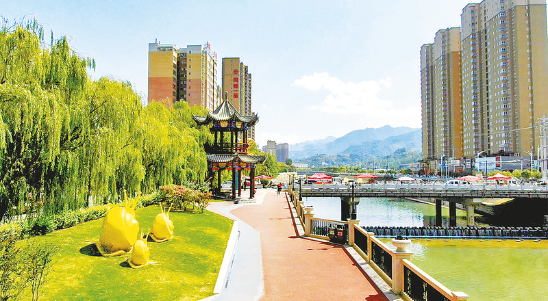 在山陽(yáng)縣城濱河公園,碧水藍(lán)天與現(xiàn)代城市構(gòu)成美麗畫卷。