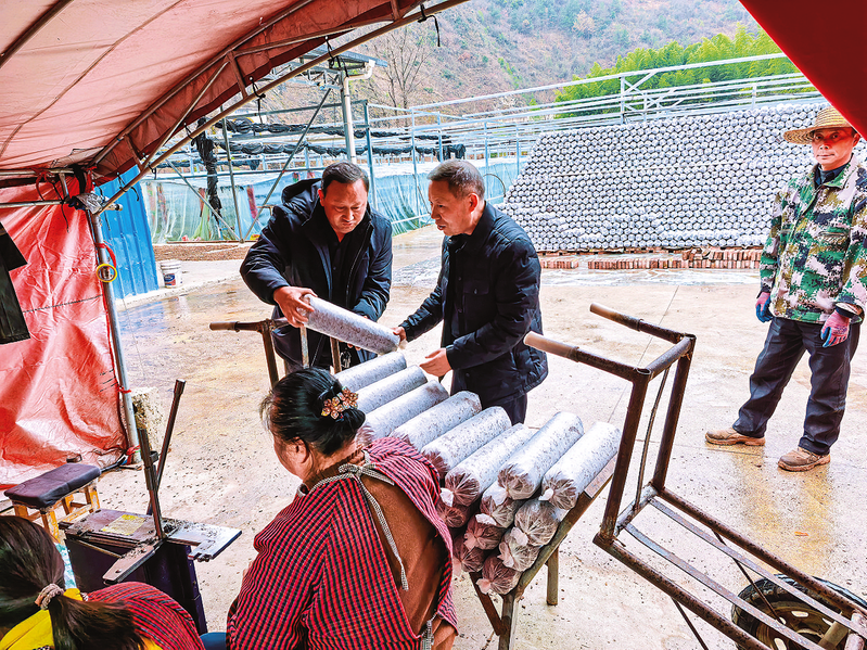 山陽(yáng)縣農(nóng)業(yè)技術(shù)人員深入戶家塬鎮(zhèn)桃園村香菇基地,現(xiàn)場(chǎng)指導(dǎo)香菇菌袋制作。