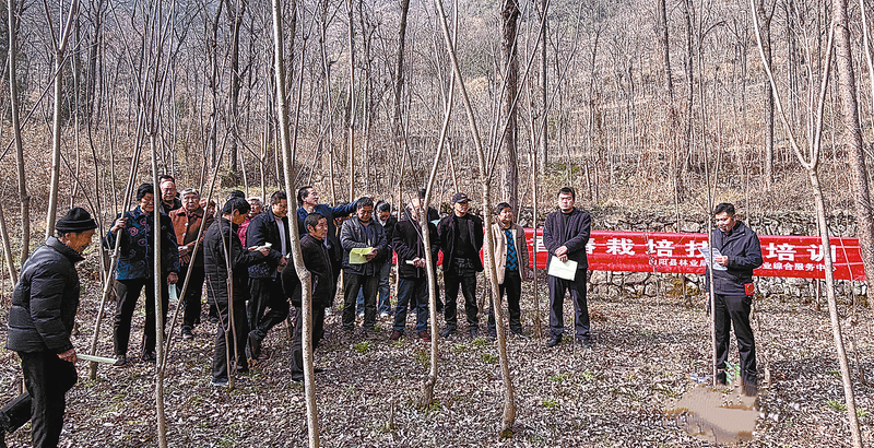 林業(yè)技術(shù)專家現(xiàn)場(chǎng)為種植戶講解香椿管護(hù)技術(shù)。