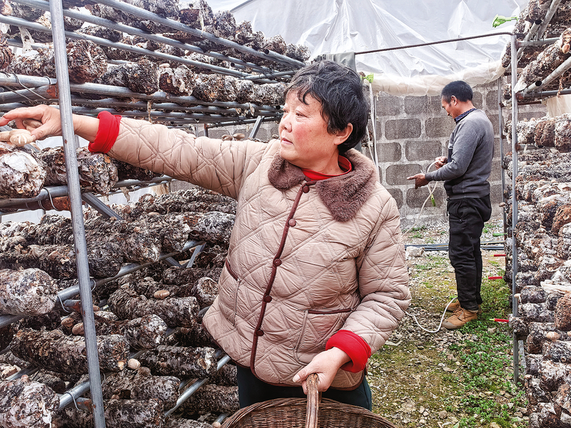 龍洞川村村民在香菇大棚里采摘香菇。