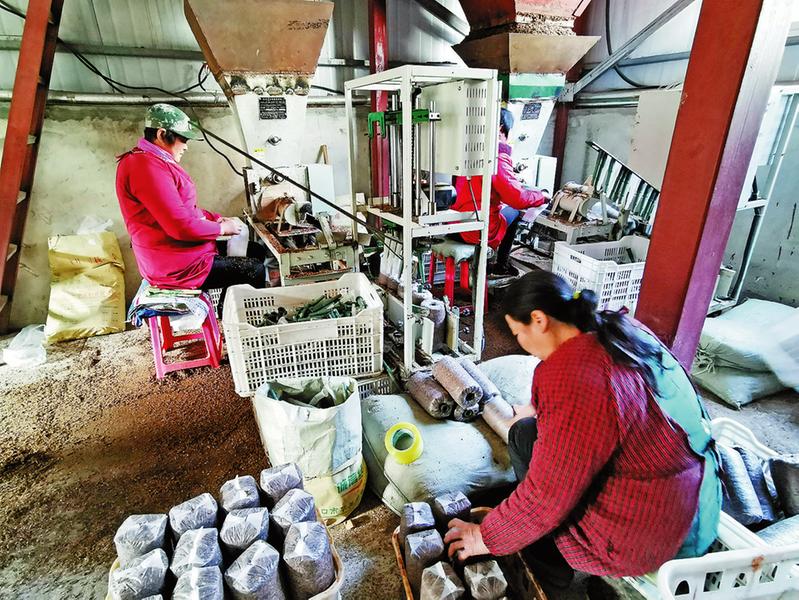 盛澤農(nóng)林科技發(fā)展有限公司生產(chǎn)車間內(nèi),留守婦女在制作菌棒。