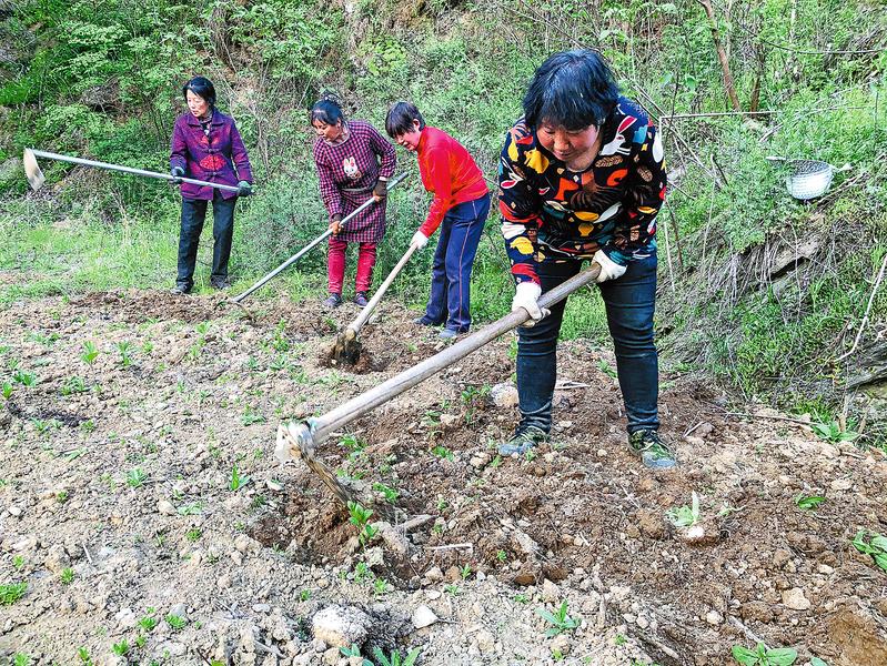 五味子基地內(nèi), 工人正在翻地除草 。