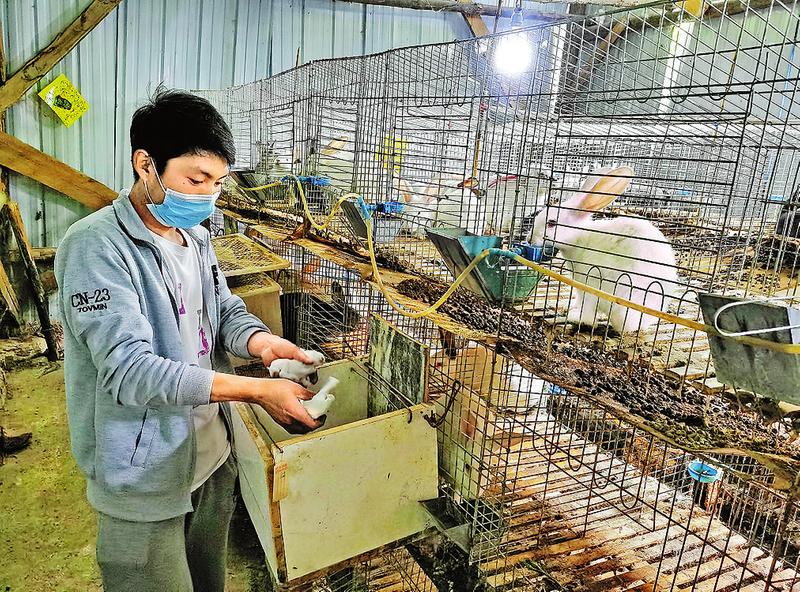 6月底,我們驅(qū)車來到位于牧護關(guān)鎮(zhèn)胡村周雙的家,在院子的右側(cè),一眼就看到一排藍白相間的房屋,周雙很自豪地介紹:“這就是我自己蓋起來的小天地。”走進房里通風(fēng)極好沒有刺鼻的異味,養(yǎng)有200多只兔子的兩排雙層籠整齊地擺放著,周雙一邊打開木箱查看剛出生的幼兔情況,一邊說:“兔子一窩可以生10多只,有時候不注意就會將個別的兔崽給壓死,所以要時不時打開木箱看看兔崽的位置,動手挪一挪。”周雙指著連接每個兔籠的白色水管說,胡村的水資源十分貧匱,生活用水很緊張。他買兔籠有贈送滴水喂水器,用了一段時間后,他發(fā)現(xiàn)十分浪費水。通過研究自己改良了噴水嘴,兔子喝的時候撞一下水槽里的撞針便會出水很節(jié)約。