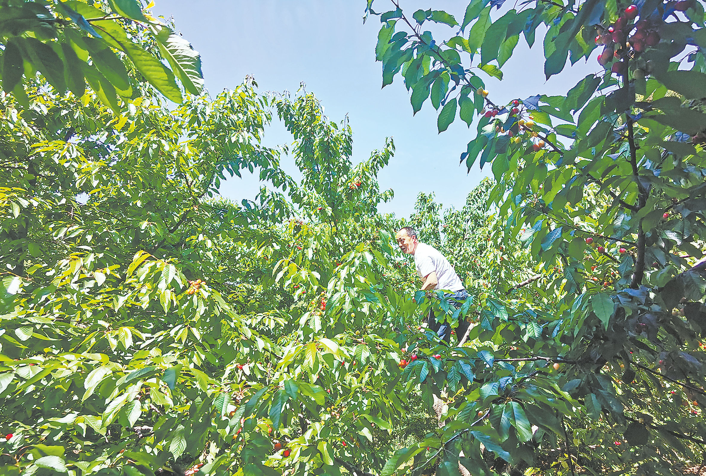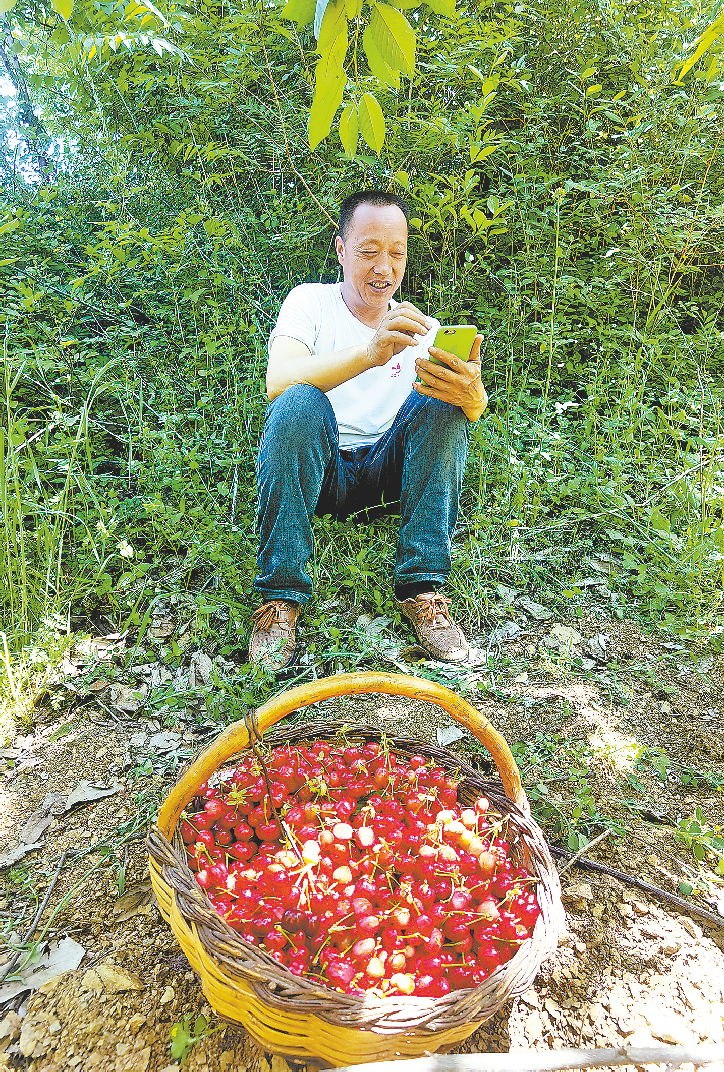 村民一邊采摘櫻桃,一邊用手機(jī)向訂購(gòu)者回復(fù)信息。