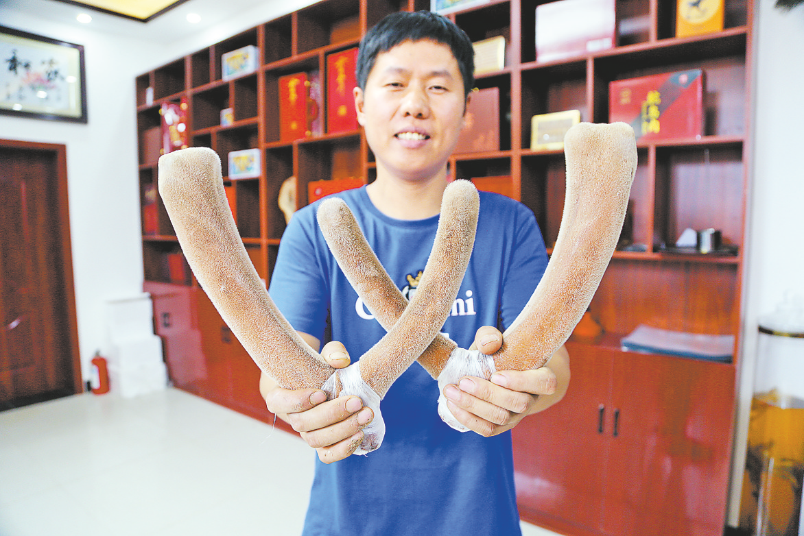 2022年5月,張朋濤第一次動手割鹿茸。盡管事前準(zhǔn)備好了麻藥、止血粉、麻繩等,但還是出了狀況。他第一次割鹿茸沒經(jīng)驗(yàn),因?yàn)楦畹锰嘀共蛔⊙?,只能用鐵絲將傷口扎緊止血。止血后,第二天,他再次將這只被割鹿茸的梅花鹿進(jìn)行麻醉,取下角上的鐵絲。張朋濤說:“當(dāng)時看著割完鹿茸血流不止,挺心慌的,想著壞了,這不會給割死了吧!結(jié)果,用鐵絲給扎緊止住了血,我才放心。”張朋濤說,梅花鹿抗病能力很強(qiáng),回來后沒出過什么問題,他計(jì)劃將鹿群發(fā)展到300多只。