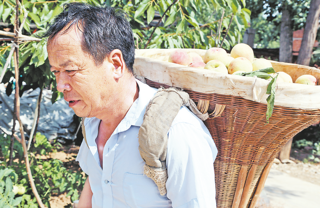 7月1日晌午,石門溝村村民張青良與妻子分別背著背簍,頂著烈日在果園里忙著摘桃子。張青良說:“早上摘的桃子都賣完了,這會兒抓緊時間摘些,傍晚的時候還能再賣一次。”