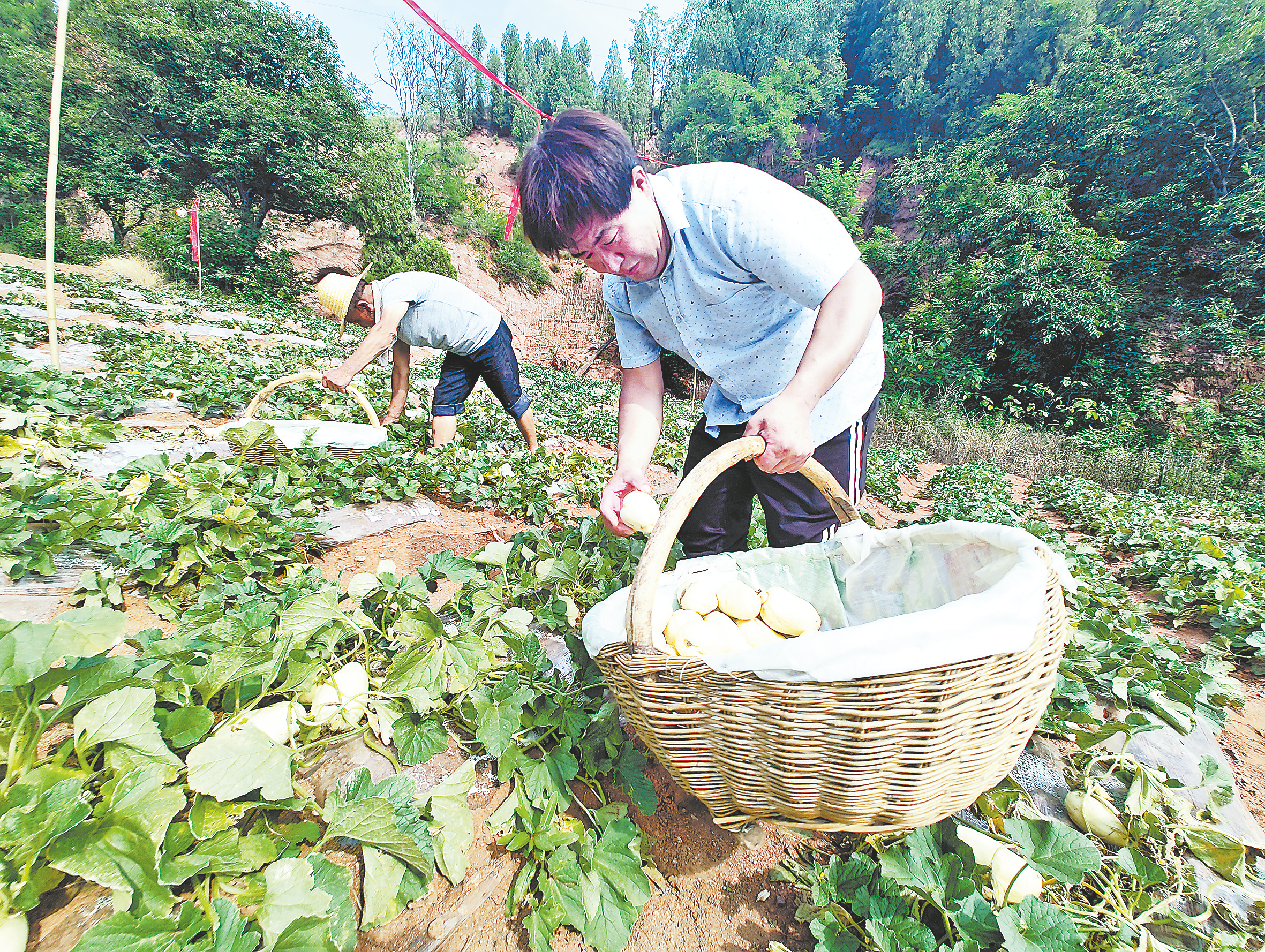 烈日下,記者遠遠看到王衛(wèi)與其父親王安娃在瓜田里彎腰摘香瓜。