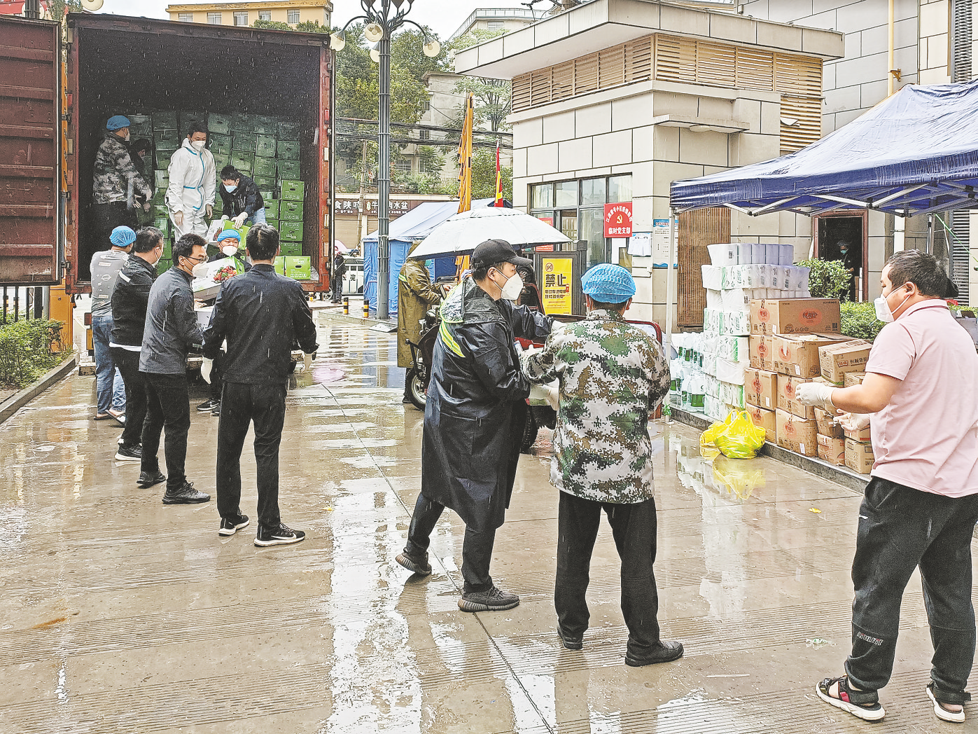 區(qū)體育運動中心干部楊曦組織志愿者排成一行組成傳送鏈,迅速開始卸車、盤點、分裝,運往本小區(qū)各單元樓,確保小區(qū)住戶及時吃到最新鮮的蔬菜。