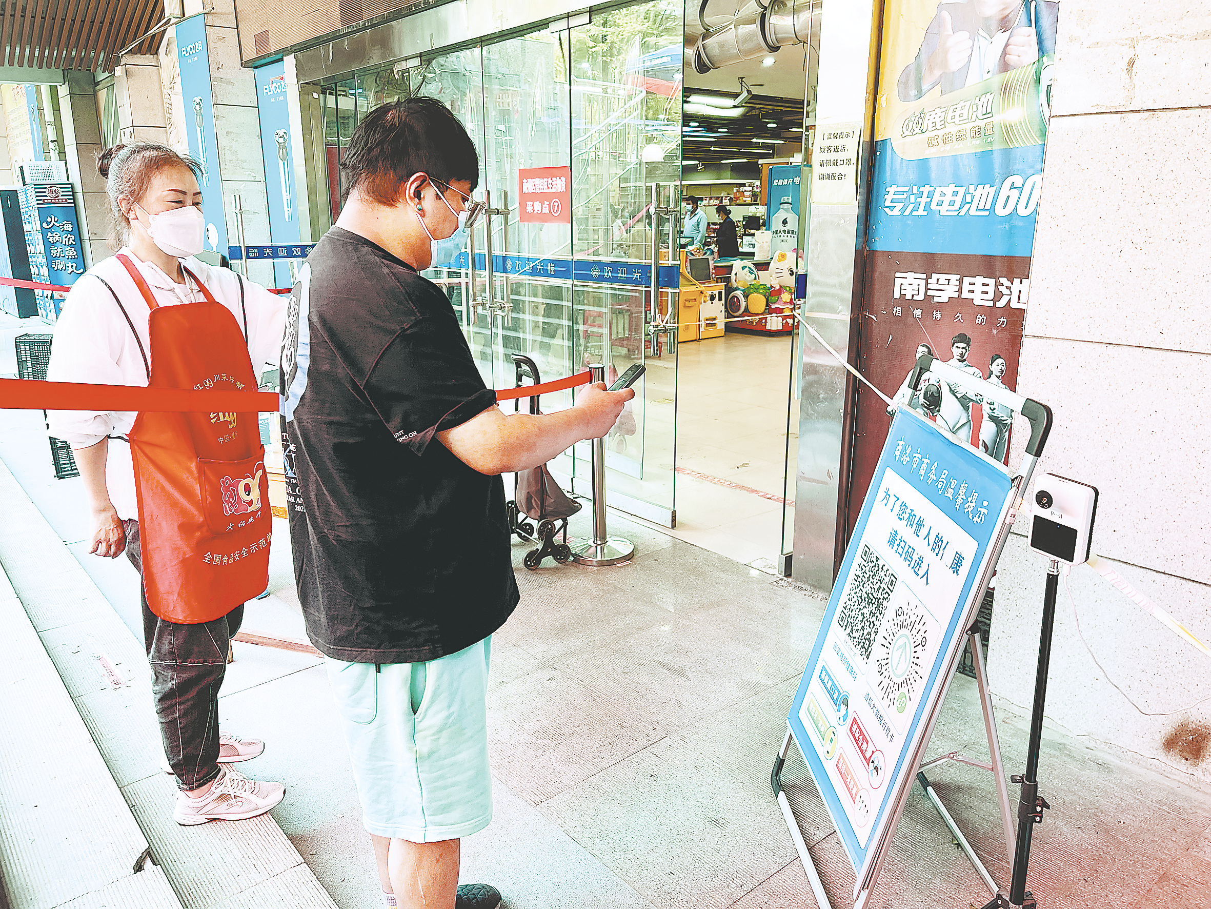 隨著商州區(qū)有序恢復生產(chǎn)生活秩序,城區(qū)各個超市逐步開放。9月5日,記者在黃沙橋家都超市門口看到,進入超市的市民佩戴口罩,保持安全距離,在工作人員的指導下測體溫、掃健康碼、酒精消毒后才能進店。在超市內(nèi)部,工作人員對購物車、購物籃、收銀臺等每小時消毒一次,保持購物環(huán)境的整潔衛(wèi)生。