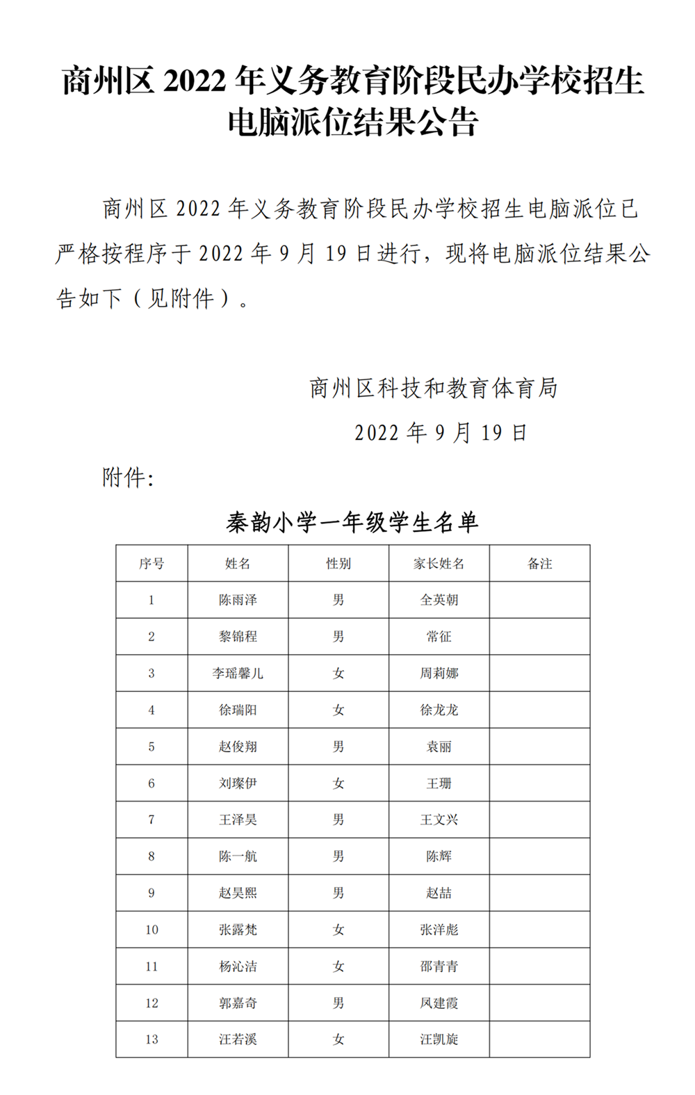 商州區(qū)2022年義務(wù)教育階段民辦學(xué)校招生電腦派位結(jié)果公告