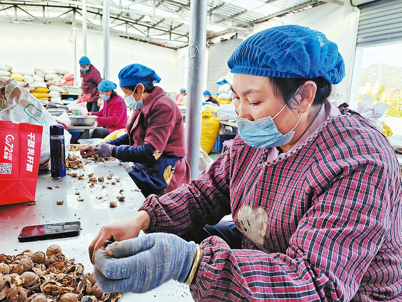 在商州區(qū)俊民林果專業(yè)合作社,幾十名中老年婦女專心致志地進(jìn)行核桃加壓、剝皮。合作社負(fù)責(zé)人趙俊民說:“建加工廠三年來,已解決110多人穩(wěn)定就業(yè),人均月收入2000元左右。”
