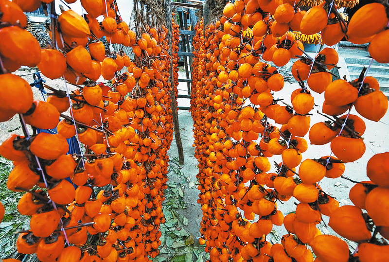 村民把去皮的柿子綁成串晾曬