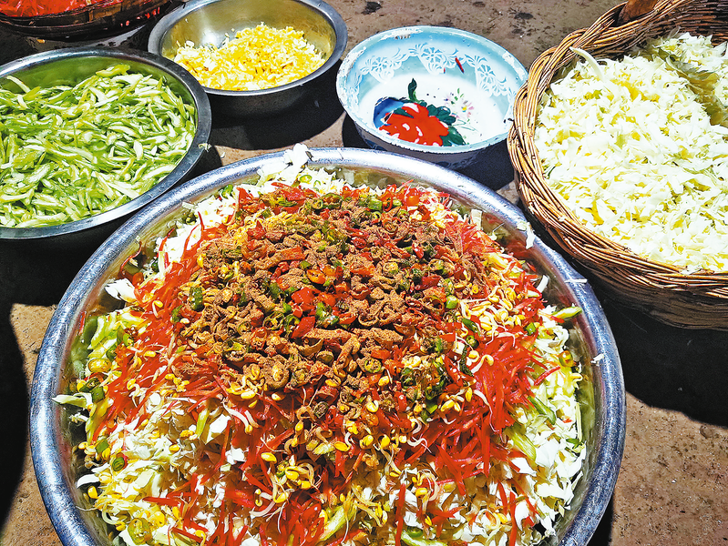 李鎖盈介紹,村里家家戶戶腌菜的用料各不相同,他家的腌菜以蓮花白為主,配以黃豆芽焯水、大蒜切片、紅蘿卜擦絲、辣椒切小段、生姜切末、芹菜切片,然后用食用鹽和十三香調(diào)味攪拌,再壓進(jìn)大菜缸等待7天左右的時(shí)間自然發(fā)酵,就成了冬天到來年春天不可缺少的腌菜。