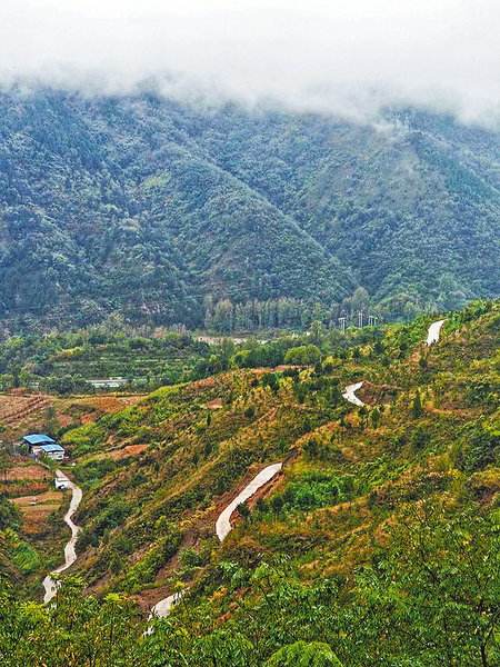 走了兩公里,水泥路到頭了,密林深處藏著一座古樸的村落。民居沿著山勢(shì)成排散布在山梁上,繞成一個(gè)金線葫蘆。