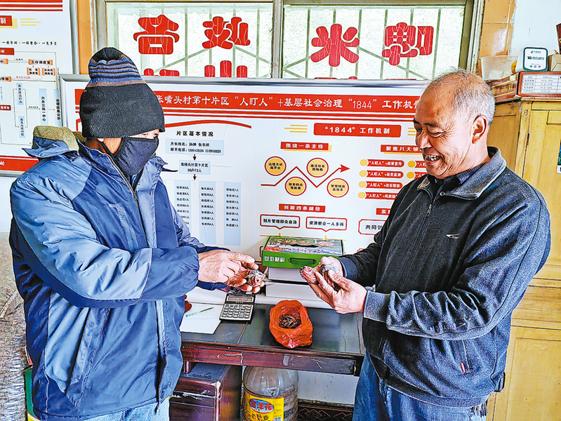 “有人在沒有,收柿餅不?”“收哩,先讓我看看你的柿餅成色咋樣!”12 月 2日,在商州區(qū)夜村鎮(zhèn)張嘴頭村,村民程福太正在路邊一個(gè)小店里售賣柿餅,他一邊和店主人張世珍交談,一邊將帶來的樣品從包裹了幾層的塑料袋子里拿出來驗(yàn)貨。