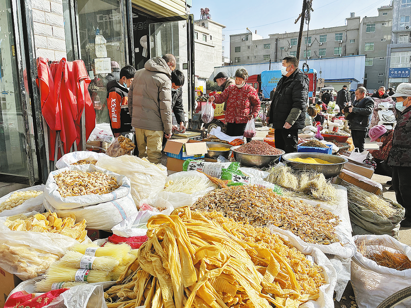 一家攤位前銀耳、腐竹、粉條等干貨琳瑯滿(mǎn)目。