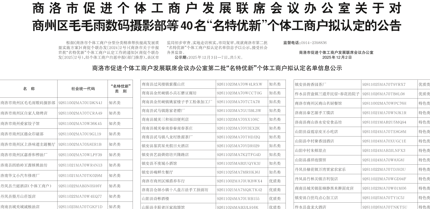 商洛市促進(jìn)個(gè)體工商戶發(fā)展聯(lián)席會(huì)議辦公室關(guān)于對(duì)商州區(qū)毛毛雨數(shù)碼攝影部等40名“名特優(yōu)新”個(gè)體工商戶擬認(rèn)定的公告