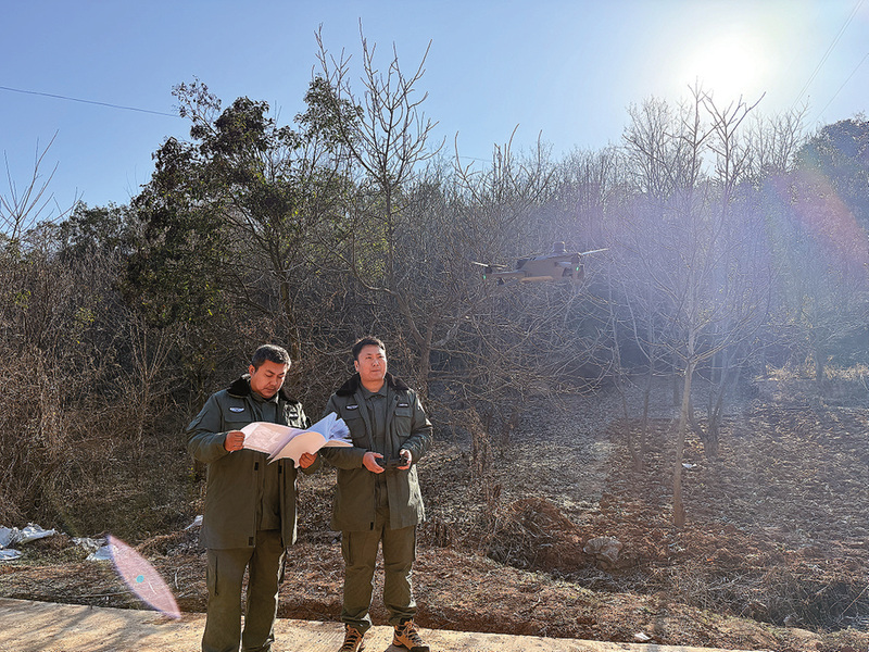 楊超(右)和張毅(左)一人操控?zé)o人機(jī)、一人配合記錄監(jiān)測點(diǎn)的信息,共同用科技力量守護(hù)青山。