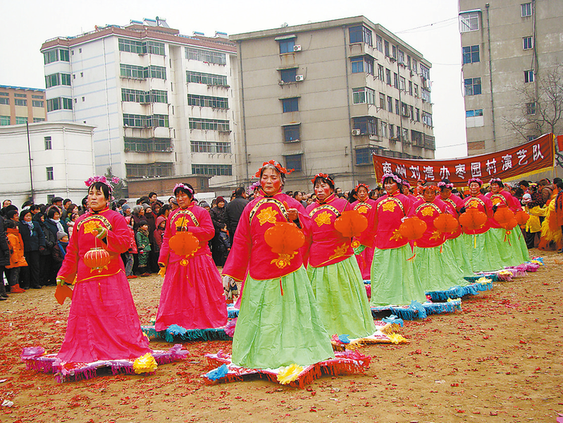 臘月時(shí)節(jié),夜幕四合。商州區(qū)劉灣街道郭王村的小廣場(chǎng)上,鑼鼓聲打破了鄉(xiāng)村的寂靜?;椟S路燈下,數(shù)十名女子排列成陣,身著獨(dú)特的六角形彩裙,左手托花燈、右手執(zhí)絹帕,身體隨著鼓點(diǎn)徐行,裙裾之下卻不見(jiàn)腳步交替,整個(gè)人仿佛在云端之上御風(fēng)飄行。
