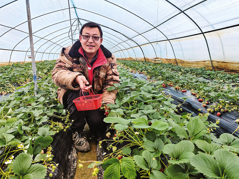 返鄉(xiāng)創(chuàng)業(yè)大學生、大棚承包戶柯雷在采摘草莓。