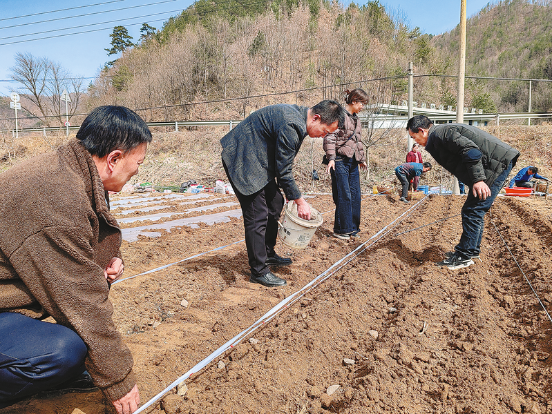 三月五日,市種子站技術(shù)人員在商州區(qū)牧護關(guān)鎮(zhèn)秦嶺鋪村指導(dǎo)馬鈴薯規(guī)范播種,幫助群眾篩選適宜本地推廣的優(yōu)質(zhì)高產(chǎn)馬鈴薯新品種,為春耕生產(chǎn)及夏收豐產(chǎn)筑牢良種基礎(chǔ)。(本報記者 楊鑫 攝)