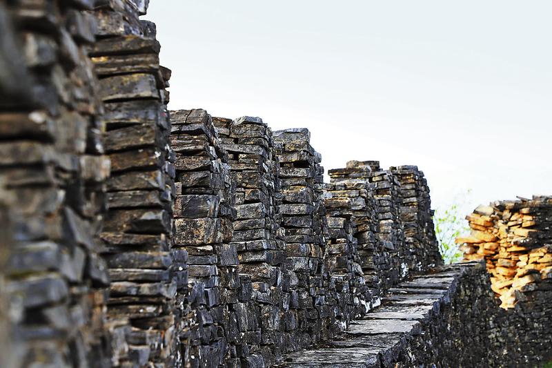 我們來到位于鎮(zhèn)安縣米糧鎮(zhèn)的西寨,山巔樹木橫生,寨墻高聳,散發(fā)著金屬光芒的黑色片石一層層壘砌成寬厚的鐵壁,顯得雄渾壯觀。西寨建在山脊上,易守難攻。據(jù)了解,這個山寨是當(dāng)?shù)厝罕姙槎阃练饲謹_而建,寨內(nèi)機關(guān)重重。如今,寨門左面內(nèi)側(cè)還留有幾孔外小內(nèi)大呈斗形的射擊孔。寨墻上有防翻石沿,寨門上方設(shè)有洞口,都有抵御外敵的作用。