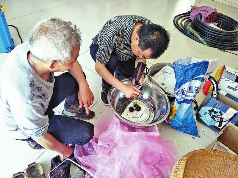朱光平在觀察“鎮(zhèn)核1號(hào)”果實(shí)生長情況