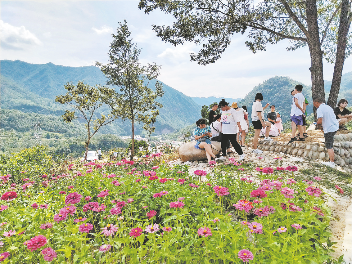 羅家營距離鎮(zhèn)安縣城40多公里,地處旬河岸邊。今年以來,鎮(zhèn)安縣依托鄉(xiāng)村振興工程,圍繞羅家營水庫,打造鄉(xiāng)村游示范村。沿河修建了通村公路,并在路邊種植各種花卉。眼下正是鮮花盛開之際,加上坡地數(shù)百畝成片的向日葵競相開放,整個羅家營就像一幅山水畫,避暑賞花的人絡(luò)繹不絕。