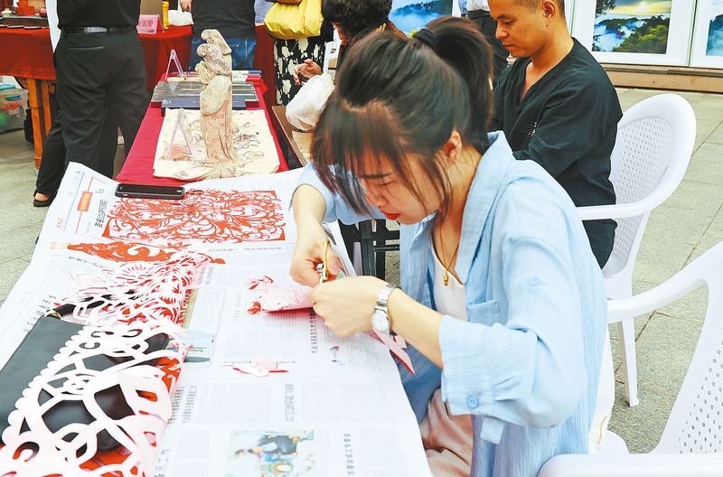 肖田在非遺交流活動現(xiàn)場剪紙。