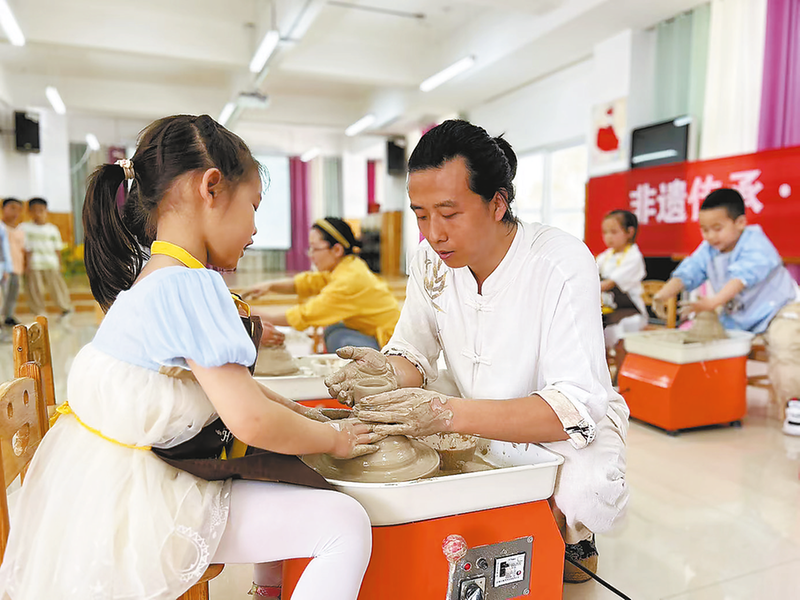 “非遺進(jìn)校園”活動(dòng)中,黃沖在鎮(zhèn)安縣第二幼兒園帶領(lǐng)小朋友體驗(yàn)陶藝制作。(資料照片)